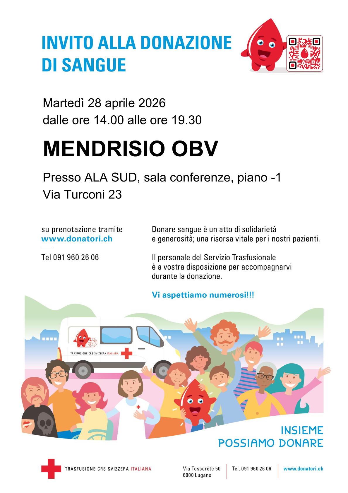 Martedì 28 aprile 2026, dalle ore 14.00 alle ore 19.30, sarà possibile donare all'OBV di Mendrisio in via Turconi 23, presso l’ala sud (sala conferenze, piano -1).