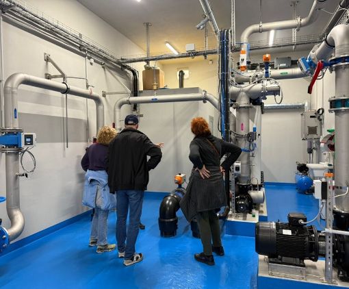 Attraverso un percorso didattico, le persone partecipanti hanno seguito il viaggio dell’acqua dalla sorgente Fontanella fino al nuovo serbatoio. L’itinerario partiva dal vecchio serbatoio La Perfetta, dove è ancora visibile l’impianto di potabilizzazione originale, basato su filtri a sabbia e clorazione. Successivamente, dopo la visita alla sorgente, è stato raggiunto il moderno Serbatoio Fontanella, dove oggi l’acqua viene trattata con un sistema di ultrafiltrazione: una tecnologia che impiega membrane con pori di soli 25 nanometri, capaci di rimuovere batteri, protozoi e virus, garantendo la massima qualità dell’acqua distribuita.