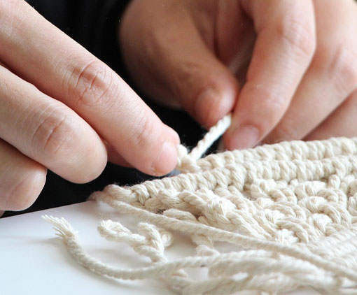 Lavori eseguiti a macramè, una tecnica artigianale che intreccia e annoda cordoncini direttamente con le mani.  Le origini del macramè sono probabilmente da ricondurre ai tessitori arabi del XIII secolo. Il macramè è anche apprezzato come attività rilassante e creativa.